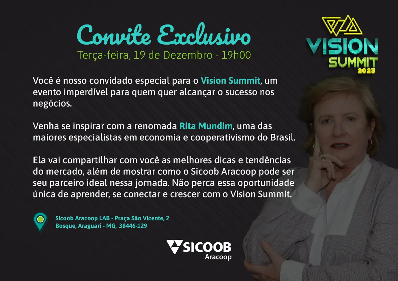 O “Vision Summit” foi um evento realizado em dezembro de 2023 que abordou temas de cooperativismo e economia, com o objetivo de educar os participantes sobre o mercado financeiro e as tendências econômicas futuras. O evento também se destacou por suas práticas sustentáveis, como a substituição de materiais impressos por papel semente, que pode ser plantado para gerar vegetais e flores, contribuindo para o sequestro de carbono.