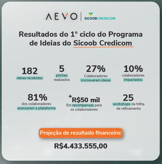 O primeiro ciclo do programa de ideias do Sicoob Credicom, em 2023, alcançou um notável sucesso em termos de resultados. No total, 82% dos colaboradores acessaram a plataforma de ideias, sendo que destes, 28% deram ideias. Foram realizados 5 pitches, além de 25 workshops da trilha de refinamento do Coolab e mais de R$50 mil distribuídos em recompensas aos colaboradores.