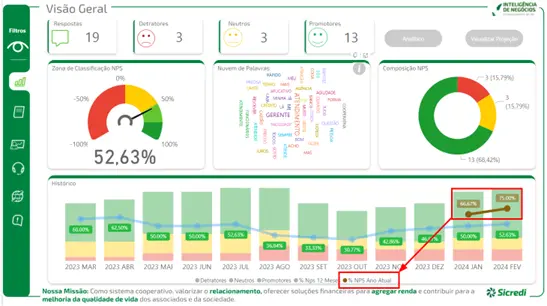 Também se nota os resultados das mudanças realizadas através da evolução das notas de NPS, em que o associado informa sua satisfação com o atendimento realizado. Neste indicador, a Regional apresentou aumento no NPS total, em que agências apresentaram aumentos mais significativos, tais como a agência de Concórdia do Pará/PA com incremento de 8,33% e a agência de Goianésia do Pará/PA com incremento de 11,84% no NPS do último ano e 33,34% no último mês.