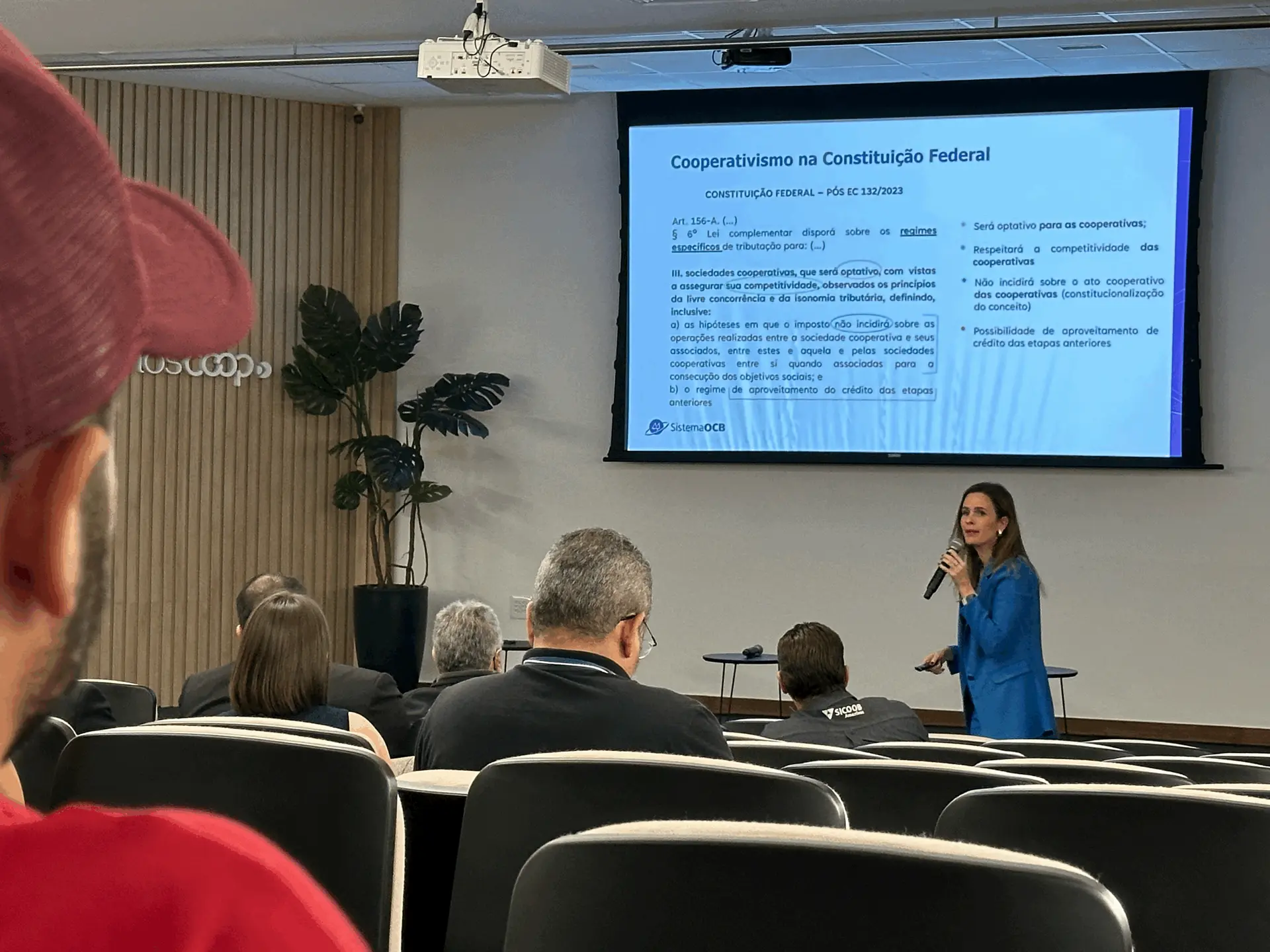 Clara Maffia falou sobre o trabalho de representação do Sistema OCBA gerente de Relações Institucionais do Sistema OCB, Clara Maffia, apresentou a estratégia de representação do cooperativismo junto aos Três Poderes e detalhou os projetos prioritários em tramitação no Congresso Nacional, como a regulamentação da Reforma Tributária (PLP 68/2024) e o PLP 519/18, que amplia a participação das cooperativas no mercado de seguros. Clara destacou a importância de garantir condições justas para que as cooperativas sigam atuando de forma competitiva nos mercados em que estão inseridas.